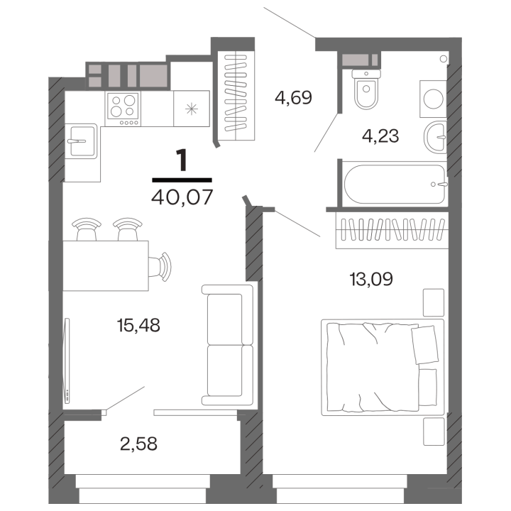 1-комнатная, 40.07 м²