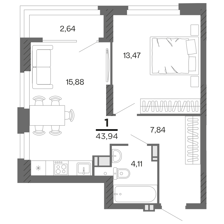 1-комнатная, 43.94 м²