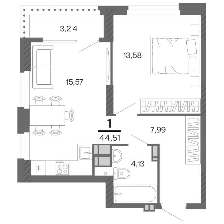 1-комнатная, 44.51 м²
