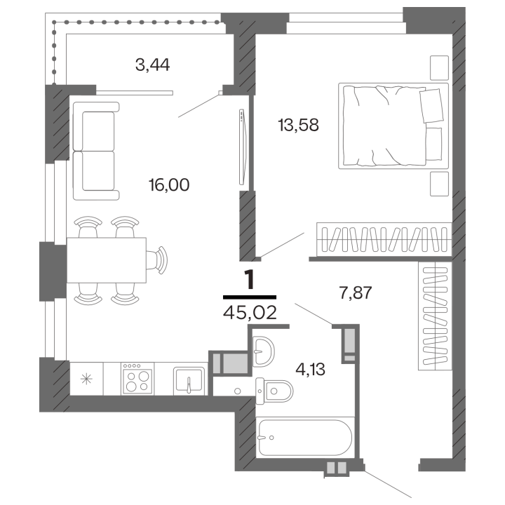 1-комнатная, 45.02 м²