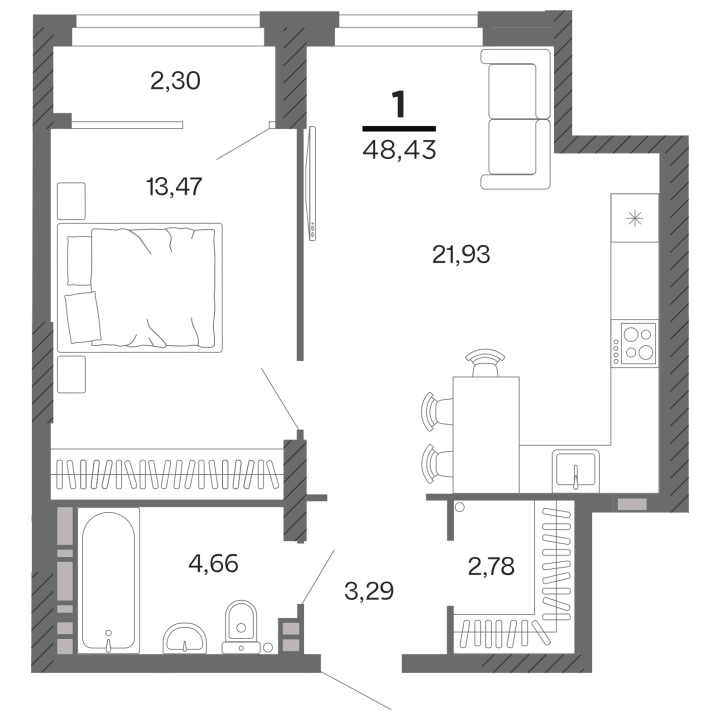 1-комнатная, 48.43 м²