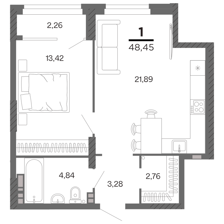 1-комнатная, 48.45 м²