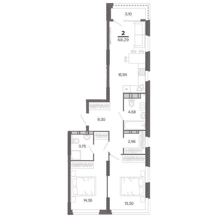 2-комнатная, 68.29 м²