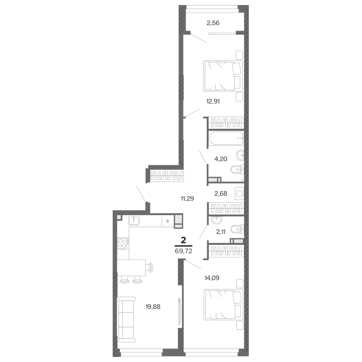 2-комнатная, 69.72 м²