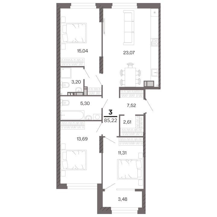 3-комнатная, 85.22 м²